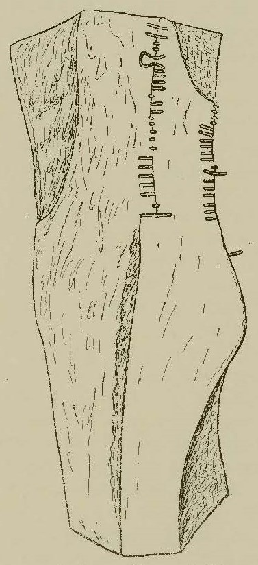 Condition: Of extremely irregular shape, Macalister (1945, 124) noted that the stone bears ‘unmistakable evidence of the attacks of a sledge-hammer or of some similar tool’. He also suggested (1945, 126) that ‘there has unquestionably been an earlier inscription on the stone, and the severe battering which has left evident marks has completely destroyed it’. Macalister (1945, 84) recorded the height of the stone as 1.57m (5 ft. 2 in.) but only 1.52m are currently accessible. All of the ogham stones in the UCC collection underwent conservation in 2006. The stones are currently in display cases and held in position by brackets.
