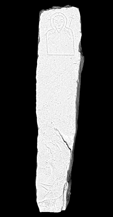 Discovery: Discovered just inside the gate of the graveyard at Cillín Chormaic (beside the figure-carved pillar described below) by Rev. John F. Shearman in 1860 and reported to members of the Royal Irish Academy in 1865 (Shearman 1864-1866, 253-260). Seven ogham stones (or fragments) in total were found at this site, one of which (I-KID-002 Colbinstown 2) seems to have been broken up and at least one fragment re-used in the repair of the surrounding wall in the late 19th century (FitzGerald 1895, 380-2). This is the largest collection of ogham stones found at a single site in Leinster. Four complete ogham stones and two fragments survive today. A geophysical survey carried out in the surrounding fields in 2012 revealed traces of a trivallate enclosure (max. diam. 205m) surrounding the burial ground, which occupies the centre of a much more extensive early medieval ecclesiastical site (Greene 2013, 37-40). In addition to the ogham stones, a number of other notable monuments (some of granite) have also been discovered at the site, including numerous (uninscribed) pillar stones and three probable cross slabs (Greene 2013, 33-36; Macalister and Praeger 1928-9, 253-61). One of the pillar stones (KD032-044016-), a slender earthfast stone (H 1.3m; L 0.35m N-S; Wth 0.25m), which this ogham stone was found standing beside, has a lightly carved bust on the upper N face: a head, with a very pointed chin, is shown with a possible hooded-cloak and the figure carries a cross over its left shoulder (see image).