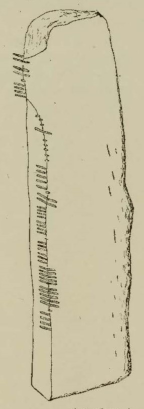 Text field: The inscription commences 0.38m (15in.) from the base and runs up one angle of the stone (Macalister 1945, 102).