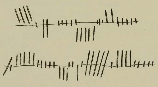 Letters: The ogham strokes in this inscription (also its companion (I-ANT-001) are particularly lightly scored, described by Macalister (1945, 297) as ‘little more than pin-scrapes’. Buick (1900, 266) noted that ‘the average length of most of the consonants is three-fourths of an inch (c. 1.9cm). Others, however, run up to an inch (2.5cm), and a few, such as Rs and Ms, to a couple of inches (c. 5cm). All of them look as if they had been scored in with a nail’.