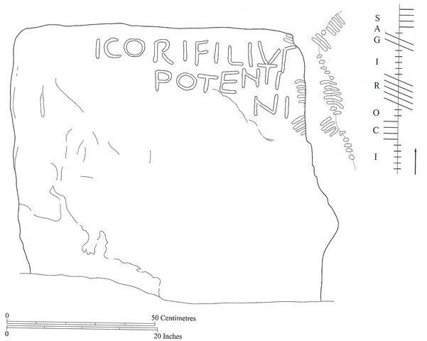 The roman-letter inscription is in the ‘X son of Y’ formula. The first name in the inscription, Icorix appears to have both British and Celtic influence while Potentinus is Latin and use of this name is paralleled elsewhere in Britain and Ireland (Edwards 2013, 272-273).