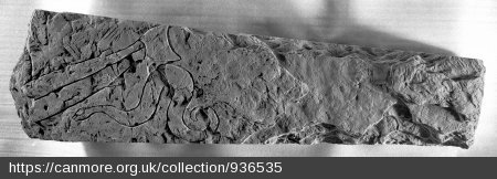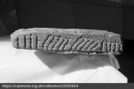 Decoration: The slab is incised on both broad faces with three pairs of Pictish symbols. At the narrow end of the smooth face of the slab, a notched double-disc and fish was finely pocked and rubbed. At the broad end of the smooth face of the slab is an ‘indistinct group of symbols which were not noticed at first’: a mirror and tuning fork (Forsyth 1996, 338). On the rougher of the two broad faces, there is a serpent and fish which were cut with a chisel or knife, to produce a V-section groove (Forsyth 1996, 339).