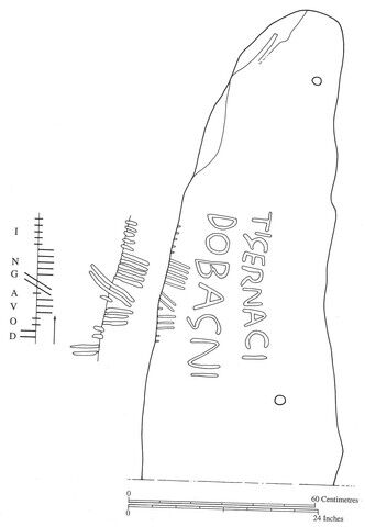 ‘DOVAGNI and DOBAGNI are clearly the same person, and the roman and ogam inscriptions have been placed side by side which draws attention to this… The ogam inscription may commemorate the father while the roman inscription commemorates his son, with the name and patronym only, rather than the Latin “X son of Y” formula. Secondly, the same person may be commemorated in both the roman and ogam inscriptions, but TIGERNACI has been placed above DOBAGNI, rather than below, in order to show the relationship of the latter to the ogam letters’ (Edwards 2007, 326-327).