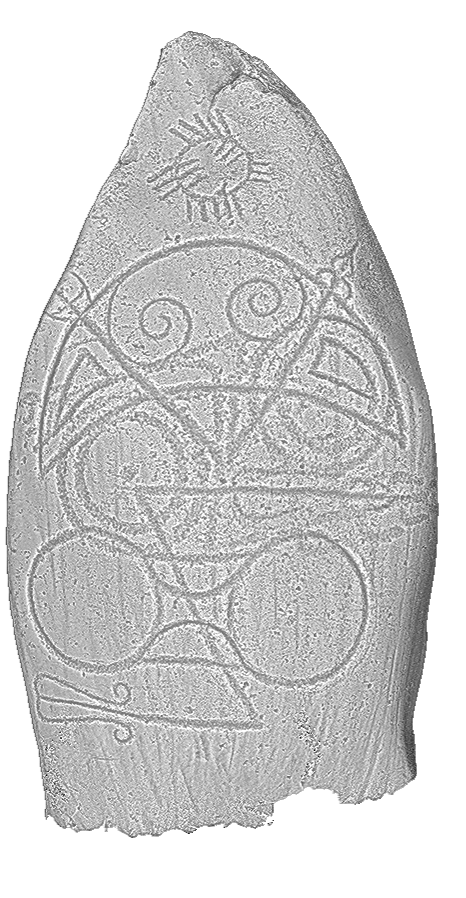 Decoration: The lower two-thirds are occupied by a pair of Pictish symbols, a ‘crescent-and-V-rod over double-disc-and-Z rod’ (Forsyth 1996, 390). The carving of the symbols is ‘broader, deeper, and smoother’ than the ogham carving, ‘but this may reflect nothing more than the larger scale of the former’ (Forsyth 1996, 391).